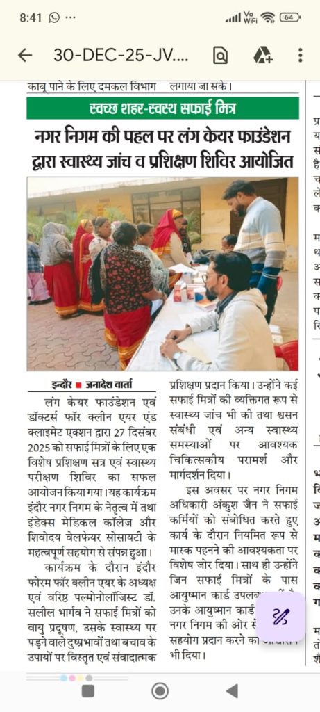 Lung Care Foundation, along with Doctors for Clean Air and Climate Action, organized an Air Pollution Training and Health Check-up Camp for Nagar Nigam Safai Mitras on 27 December 2025 in Indore. The program was conducted in partnership with the Indore Municipal Corporation, with support from Index Medical College and Shivoday Welfare Society.