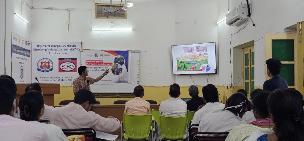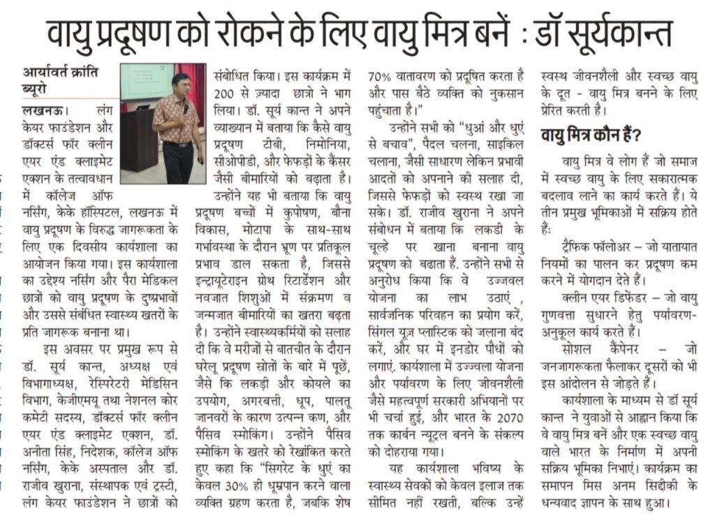 On May 20, 2025, capacity-building workshops were conducted in Lucknow at King George’s Medical University (KGMU) and KK Hospital to raise awareness among healthcare professionals, nursing students, and paramedical students about the health impacts of air pollution. The workshops aimed to strengthen the role of healthcare workers as clean air advocates in fostering healthier communities with cleaner air.