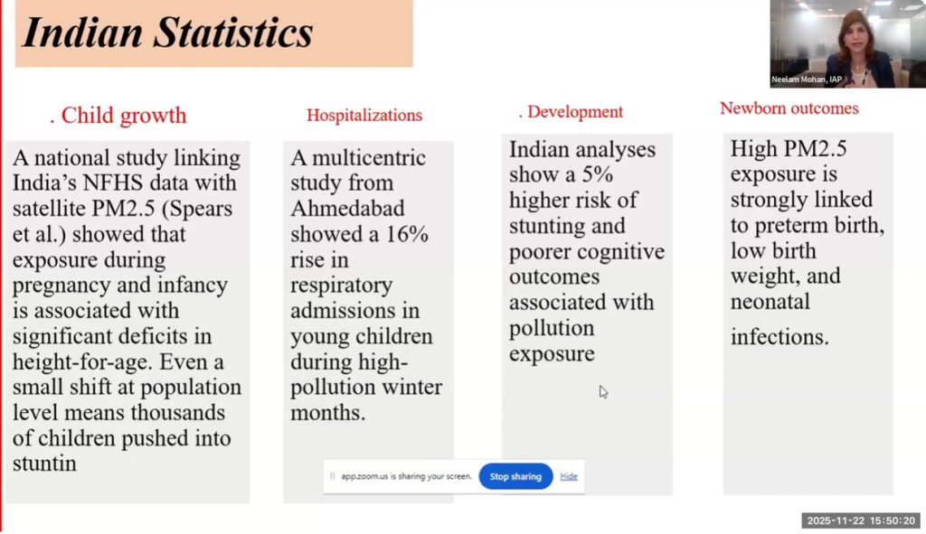 The webinar convened pediatric leaders from India, Pakistan, Bangladesh, and Nepal to examine emerging evidence on the impacts of air pollution on respiratory health, neurodevelopment, birth outcomes, and long-term disease risk in children.